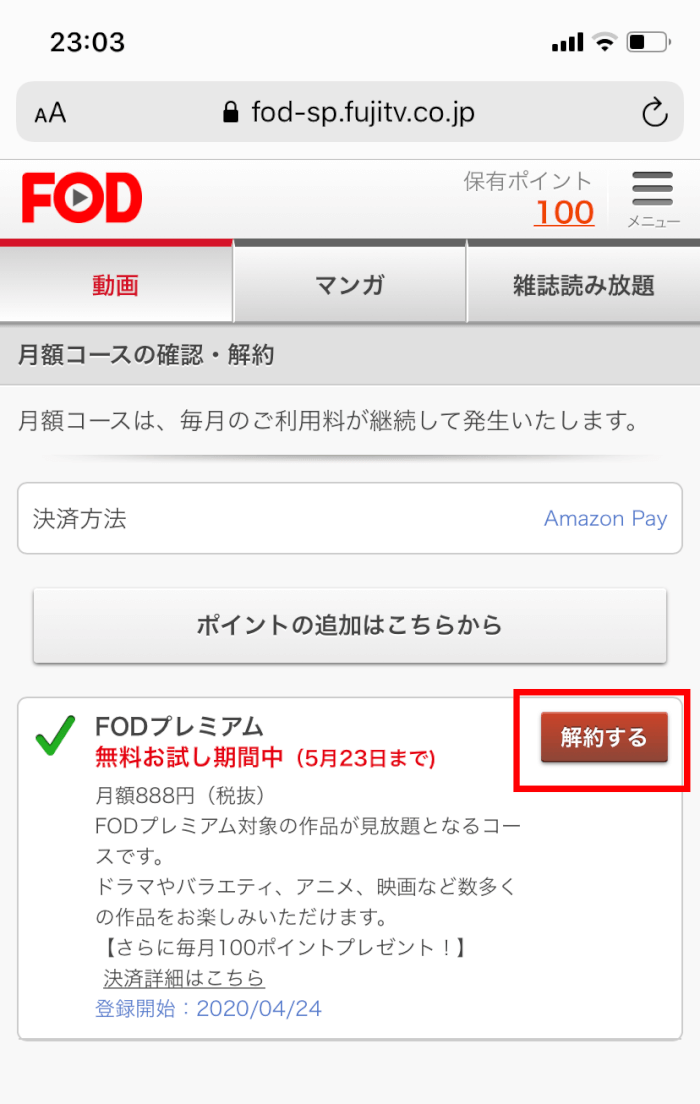 ※アプリからは解約できません。アプリをアンインストールしただけでは、FODプレミアムの解約にならないので注意しましょう。