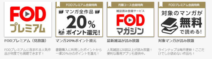 FODで販売している電子書籍マンガを購入する場合、FODプレミアム会員なら全作品で料金の20%がポイント還元されます。また、常時たくさんのキャンペーン開催されているので、FODプレミアムは動画+漫画好きにはかなりオススメです。
