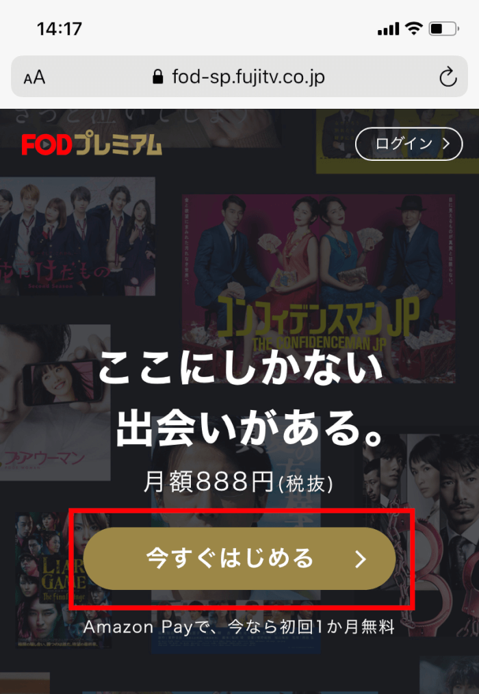 FODプレミアムにアクセスし、「今すぐはじめる」をタップ▼