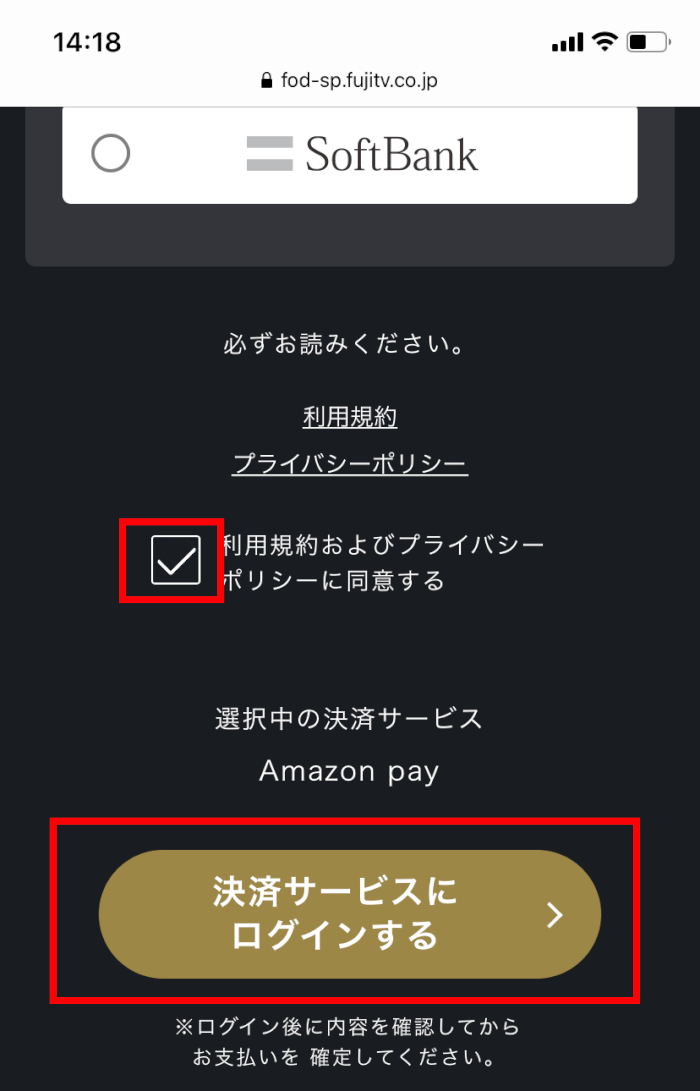 下までスクロールし、利用規約にチェックし、「決済サービスにログインする」をタップ▼