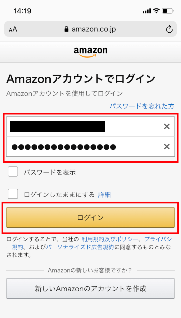 AmazonアカウントのIDをパスワードを入力し「ログイン」をタップ▼