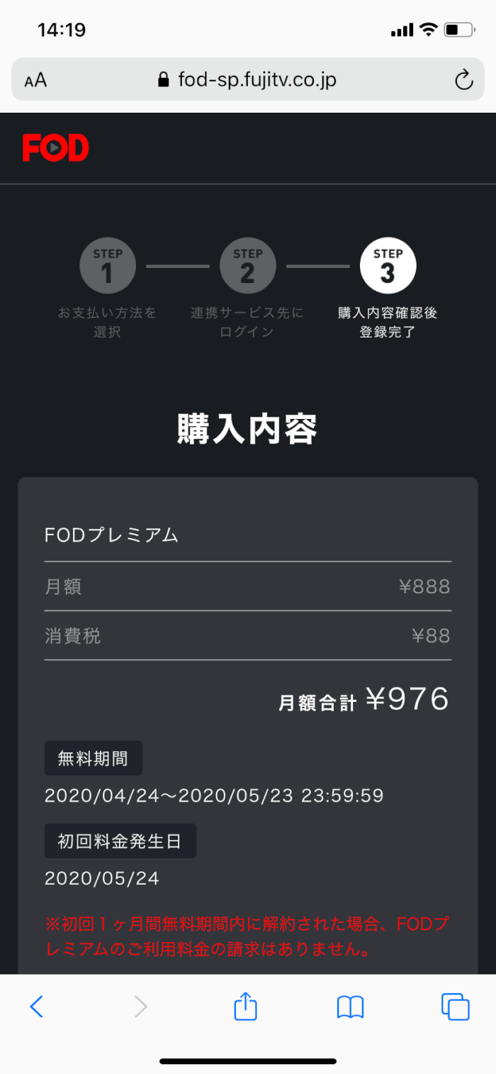 これでFODプレミアムへの登録が完了し、無料お試し期間が開始します。