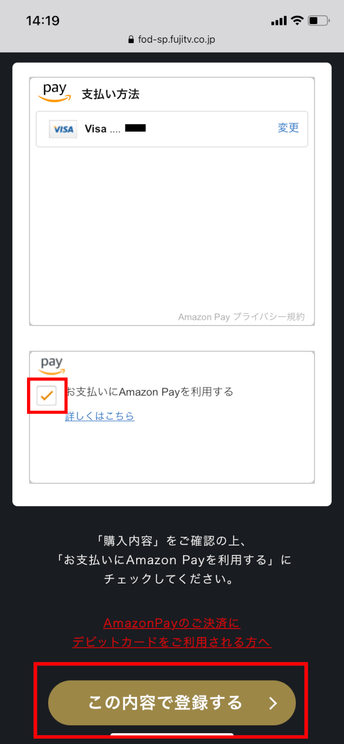 下までスクロールし、クレジットカード番号を確認したら「お支払いにAmazon Payを利用する」にチェックを入れ、「この内容で登録する」をタップ▼