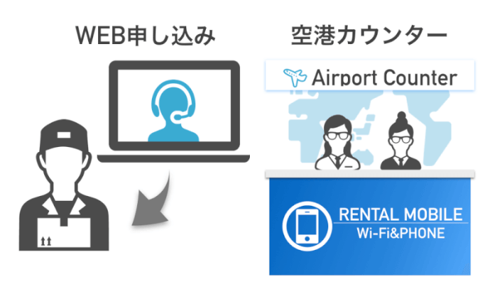 海外携帯レンタルサービスを利用したい時は、WEBや空港に設置されている窓口で申し込みしましょう。