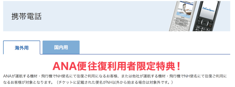 航空会社のANAも海外携帯レンタルサービスを提供しています。Telecom Square(テレコムスクエア)という事業者と提携しています。ANAの国際線を往復で予約している人は渡航中のレンタル料が無料でTelecom Square(通常600円/円)を利用できます。なので、支払うのは通話料だけで済みます。また、利用料金100円ごとにANAのマイルが1マイルが貯まります。