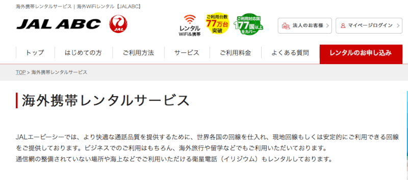 航空会社が提供している海外携帯レンタルサービスです。提供しているのは、ANAとJAL ABCです。利用料に応じてマイルが貯まるので、マイラーさんにオススメです。ただし、どちらの会社も電話番号を使ってメッセージを送るSMSが使えません。