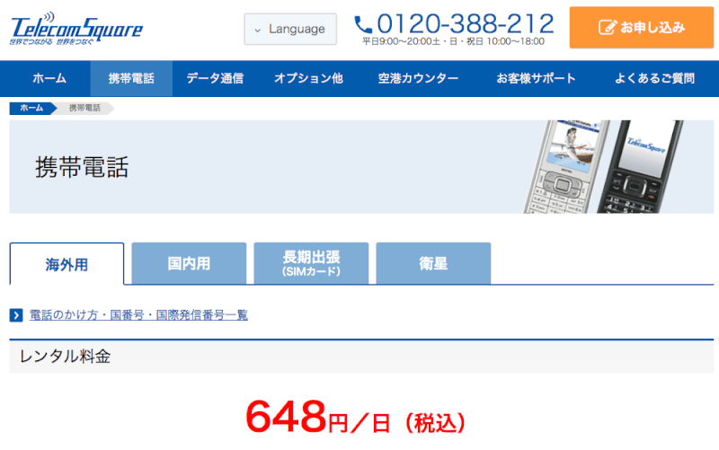 - レンタル料:675円~/1日(ガラケー)、1,850円~/1日(スマホ)
