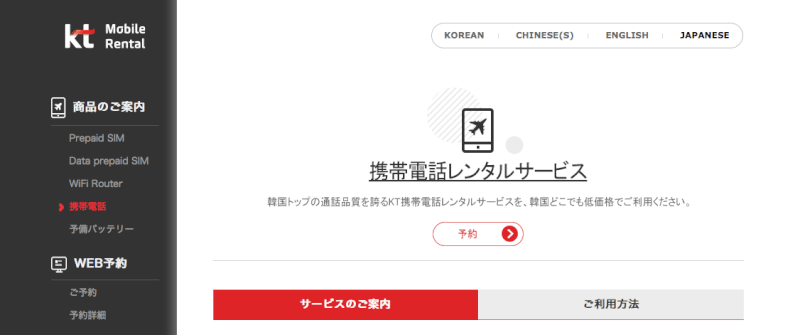 韓国の通信事業者KTの携帯電話をレンタルできるサービスです。WEBか電話(日本語対応)で申し込み可能です。受取場所は、日本の空港ではなく、韓国の空港で受け取ります。返却場所も韓国の空港なので、忘れずに返却しましょう。