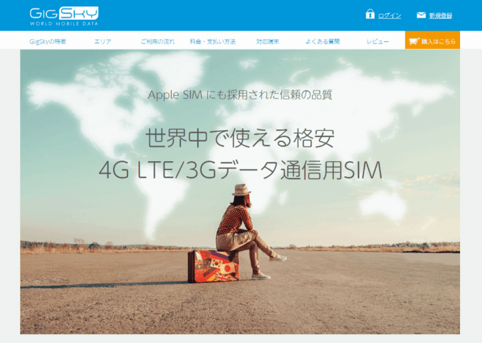 Gigsky(ギグスカイ)はApple SIMにも採用された信頼性の高い国際ローミングブランドです。90カ国以上で利用でき、アプリに登録することで簡単に国ごとのデータもチャージできます。データ通信専用のSIMなので、電話を利用する予定のある方は注意してください。