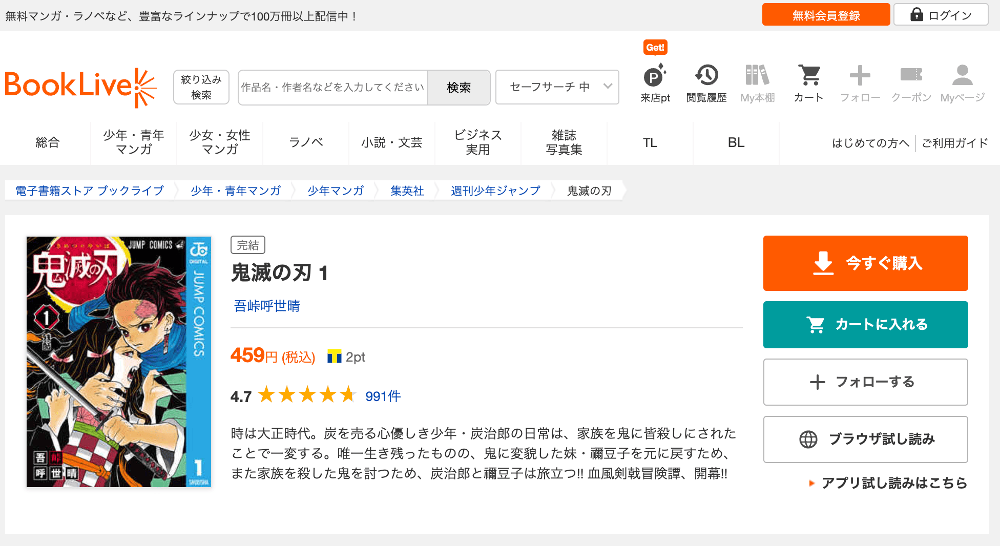 Book Liveで電子コミック版「鬼滅の刃」全巻を買う