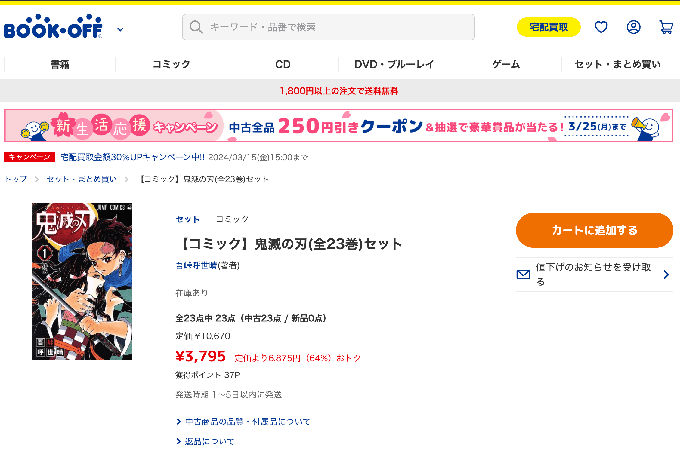 ブックオフで中古コミック「鬼滅の刃」全巻を買う