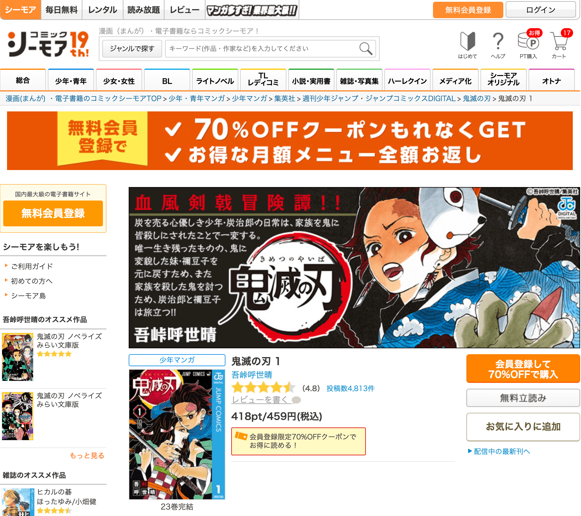 ebook japanで電子コミック版「鬼滅の刃」全巻を買う
