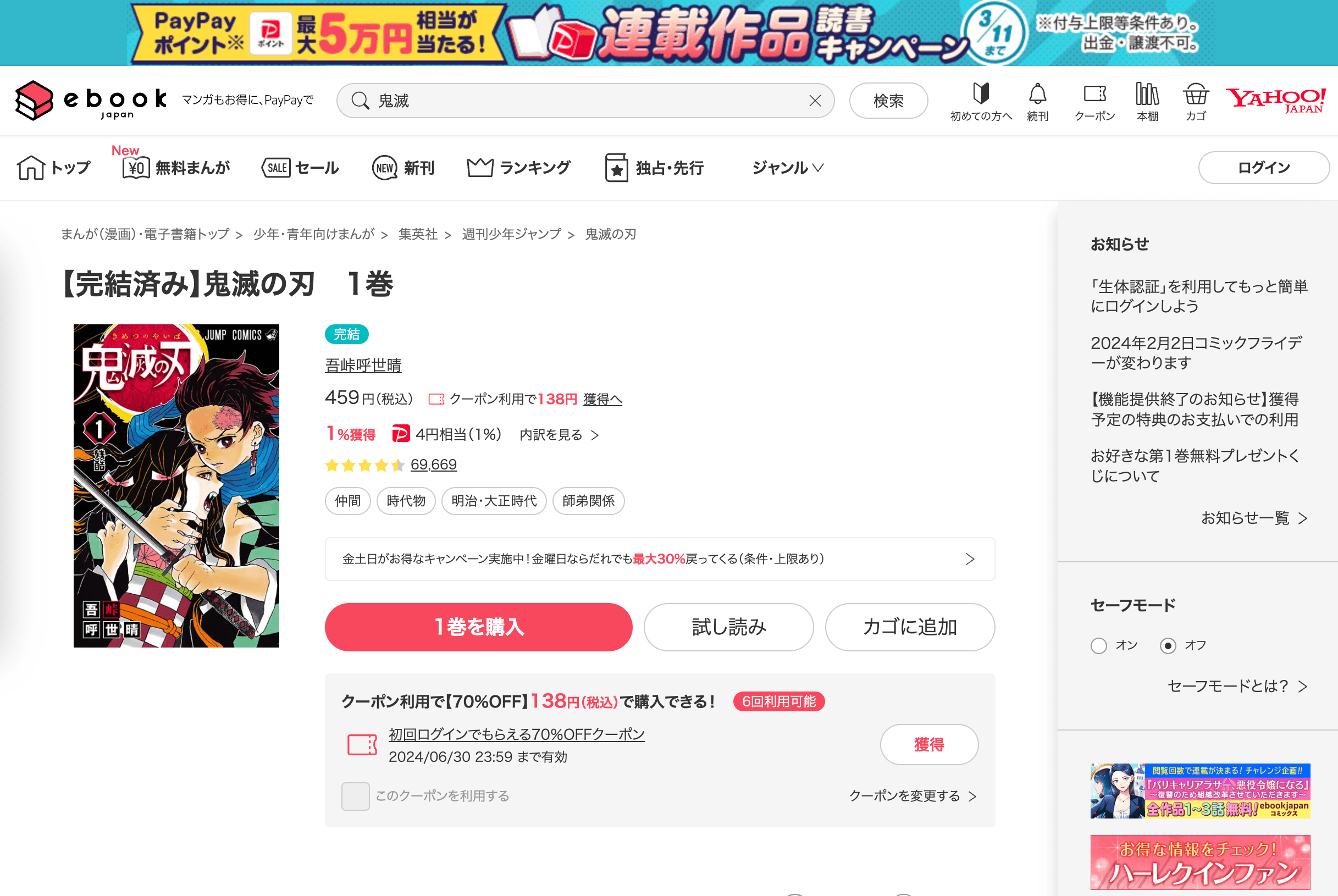初回購入時の割引や、タイムセールなどのキャンペーンが豊富で、鬼滅の刃もお得に購入可能です。初回登録の人は限定で6冊分70%OFFクーポンがもらえます。