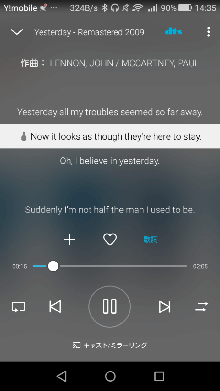歌詞表示とはその名の通り、曲の歌詞を表示してくれる機能です。KKBOXの歌詞表示機能は、再生に合わせて一行ずつ動いていくので歌詞を追いやすいです。また作詞作曲者の情報も載っていて親切です▼