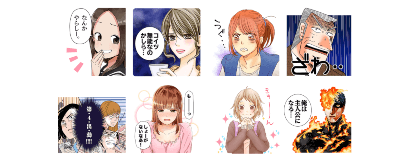 作品の中にはLINEで使える限定スタンプ付きの作品もあり、ファンであればスタンプ欲しさに、他の漫画アプリではなくLINEマンガで購入するようです。熱狂的なファンであれば、既に書籍を持っていても、スタンプ欲しさにLINEマンガ内で改めて購入するケースもあるようです。下記がスタンプの一例です。