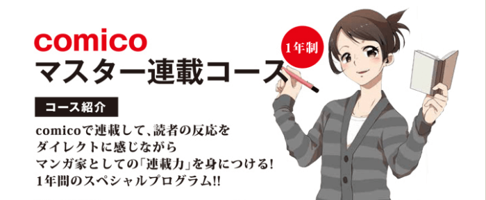 さらにcomicoでは総合学園ヒューマンアカデミー等と組んで「comicoマスター連載コース」を開講しています。1年コースでデジタルの基礎や、チャレンジ作品への投稿を目的とした演習などを通して、公式作家を目指します。公式作家になれば月に20万円以上稼ぐことも可能です。