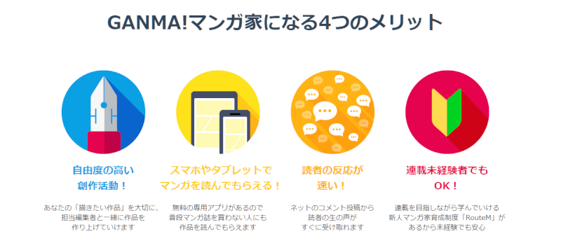 Route Mで支援を受けている漫画家の中には、紙媒体では掲載を断られながらも、GANMA!に掲載されたことで人気作品を連載している作家もいるようです。また紙と違って掲載枠が決められていないため、作家同士の仲も良く、自分の作品を良くするために切磋琢磨できる関係を作れるメリットもあるとか。