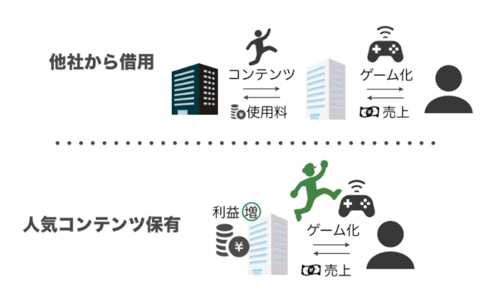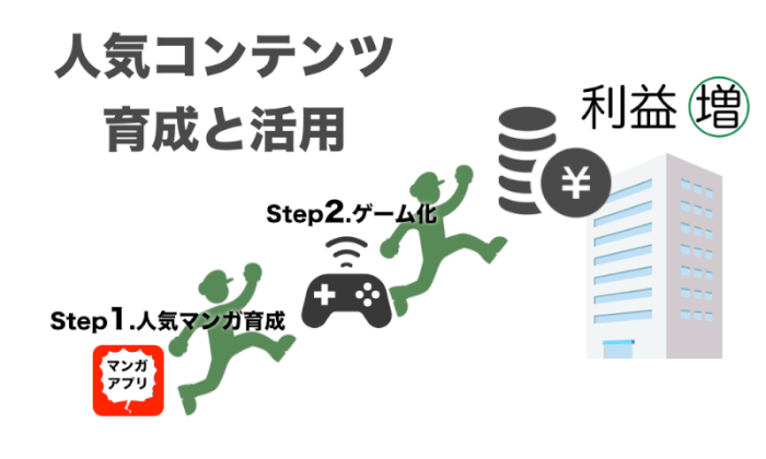 漫画アプリ自体が大きな稼ぎ頭にならなくとも、自社で育てた漫画をゲーム展開すれば、それまでライセンス元に払っていたコストを減らして得意分野であるゲーム事業で勝負できるようになります。さらには自社のキャラクターの人気が高まれば他社へIPを貸与することで、幅広く収益を生むことができるのです。