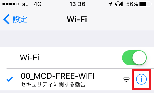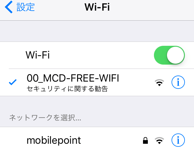①[設定]アプリ>[Wi-Fi]から、「00_MCD-FREE-WIFI」の右にある[i]をタップします▼