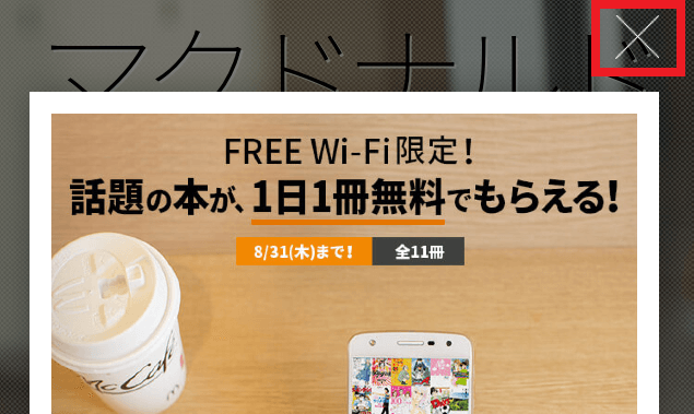 (3)ブラウザを起動させると、マクドナルド FREE Wi-FiのHPが自動で開かれます。最初に広告が出たら、右上の[✕]ボタンをタップしてください▼