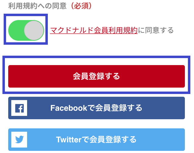 個人情報を入力後、ページ下部の[利用規約後の同意]にチェックを入れて、[会員登録する]をタップします▼※会員登録はFacebookもしくはTwitterのアカウントでもできます。