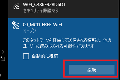 (1)「ネットワーク接続」から「00_MCD-FREE-WIFI」をクリック▼