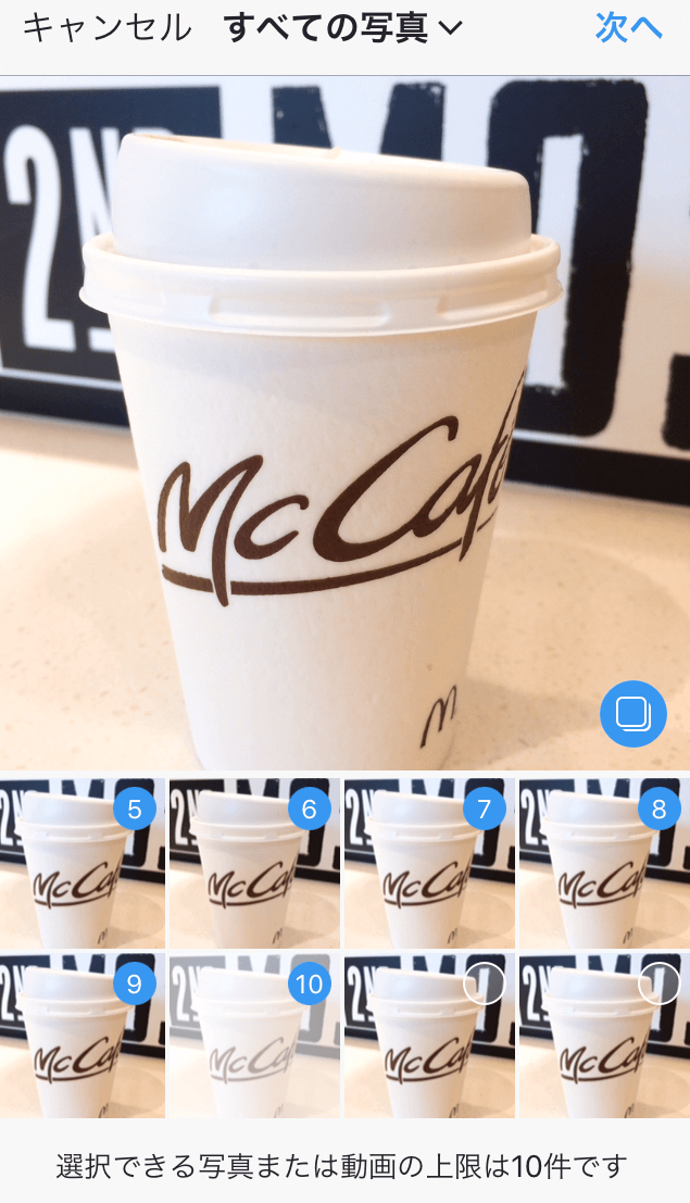 スマホで撮ったマックのコーヒーカップ画像を、インスタグラムに10枚同時投稿すると、約10秒後にしっかりとアップロードされていました。
