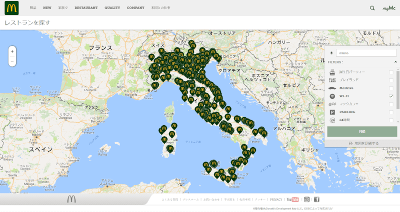 ついでにイタリアのMcDonald’sサイトも見てみましたが、Wi-Fi対応店舗は結構あるようです。
