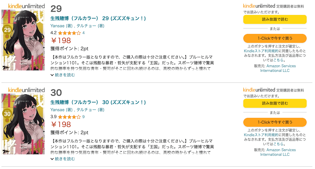 Amazonが運営する読み放題サービスのAmazon Kindle Unlimitedだと、生存賭博フルカラー版が30巻分も読むことが可能です。