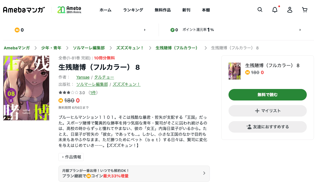 記事内では、全巻を読む方法から、各社の購入金額、無料で読む際の注意ポイントをまとめました。ぜひ最後まで読んで、生存賭博をフルにエンジョイして下さい。
