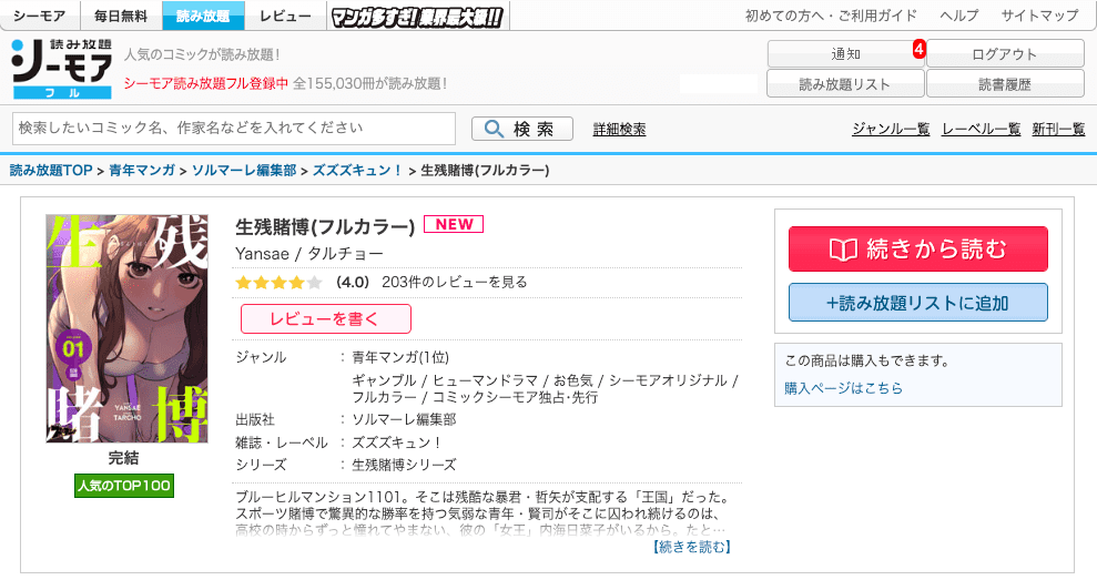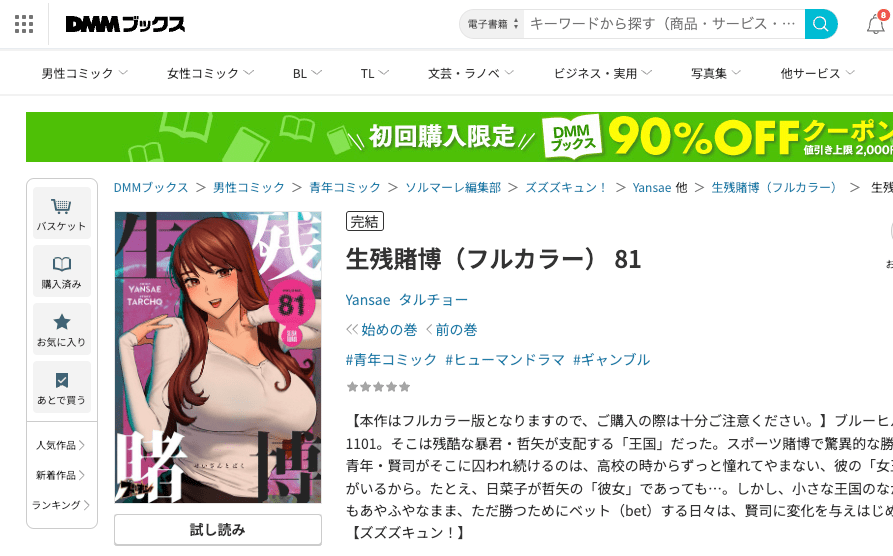 生存賭博の出版元であるNTTソルマーレが運営する電子書籍サービスの「コミックシーモア」なら全81巻を読み放題で読めてしまうのです。
