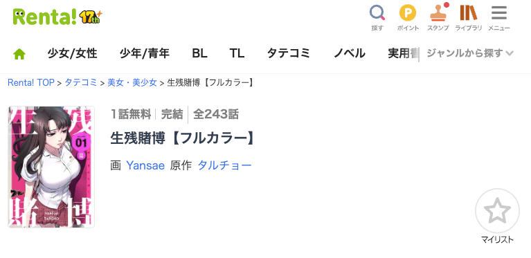 通常1万2,000円〜1万3,000円かかる生存賭博全81巻をRenta!なら、約1万円でレンタルで読破可能です。