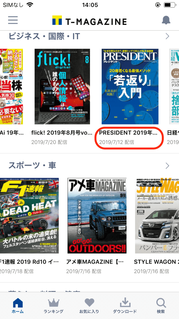 Tマガジンは、ダウンロードの方法がわかりにくいです。やり方としては、まず雑誌のタイトルの部分をタップします▼
