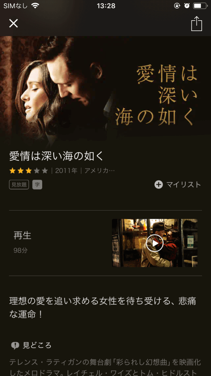 映画など1作品しかない場合、作品の詳細ページの真ん中あたりに「ダウンロード」をタップすればOKです▼