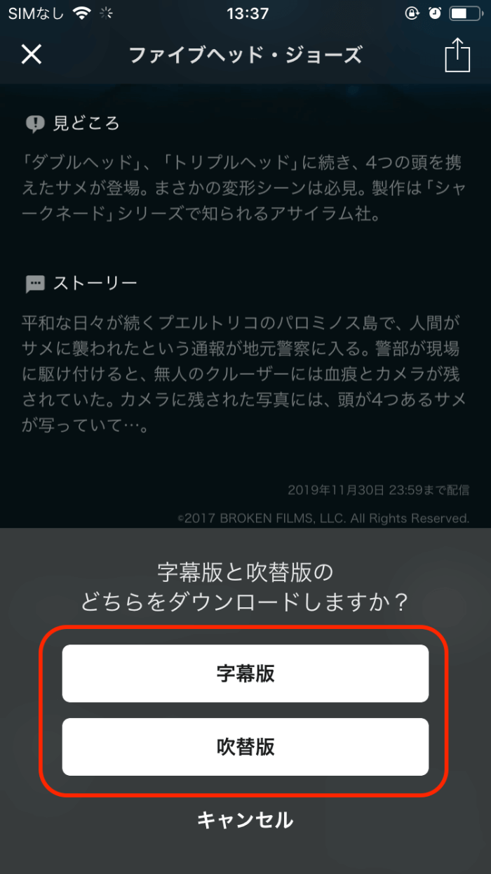 字幕・吹き替え両方がある作品なら「ダウンロード」を押した後、字幕版か吹き替え版かどちらをダウンロードするか選択できますよ▼