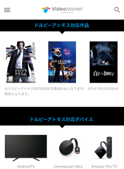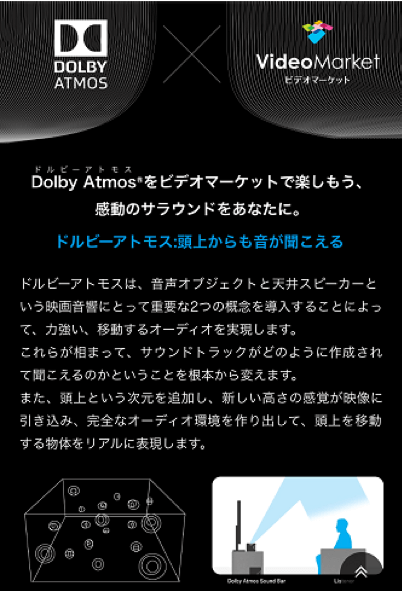 ビデオマーケットは、作品数は少ないですが、5.1chサラウンドのDOLBY ATMOS(ドルビーアトモス)に対応した作品も視聴できます。