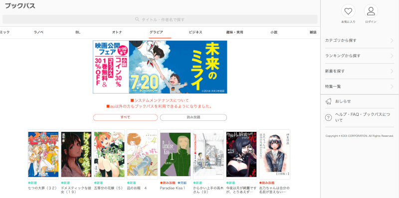 なお、ブックパスは他社のサービスではカットされることが多い、グラビア写真のページを読めることが多いです。KDDIが特殊な契約を結んでいるのかもしれませんね。