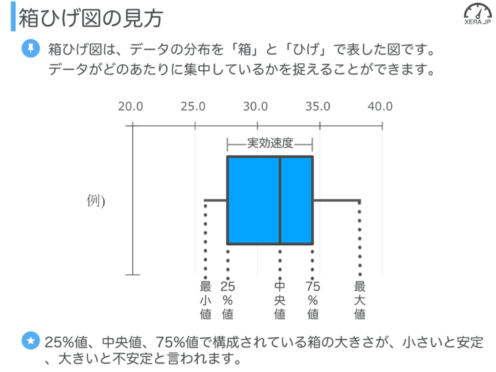 実効通信速度は箱ひげ図で表現されます。箱ひげ図は今後もたくさん出てきます。箱ひげ図の見方は以下の図を参考にして下さい▼